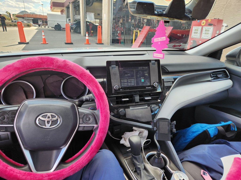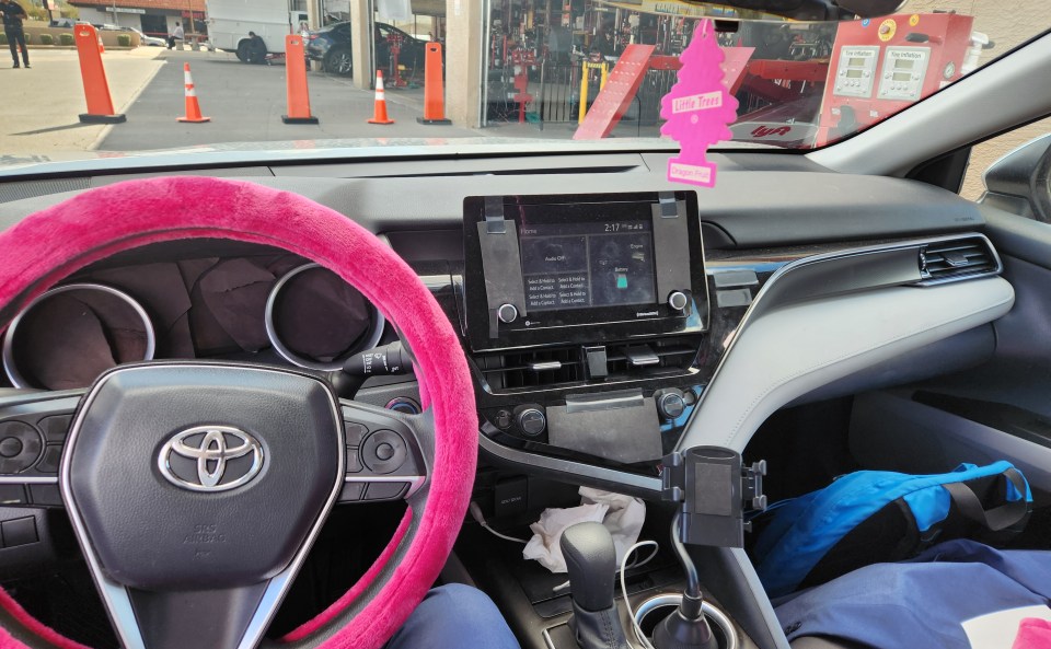 For instance: I drive with a pink air freshener, pink steering wheel cover, and I also wear a pink brimmed Arizona Diamondbacks Baseball Cap because it totally matches my car’s interior and exterior. Here is a photo of a couple pink things that I have in my car: