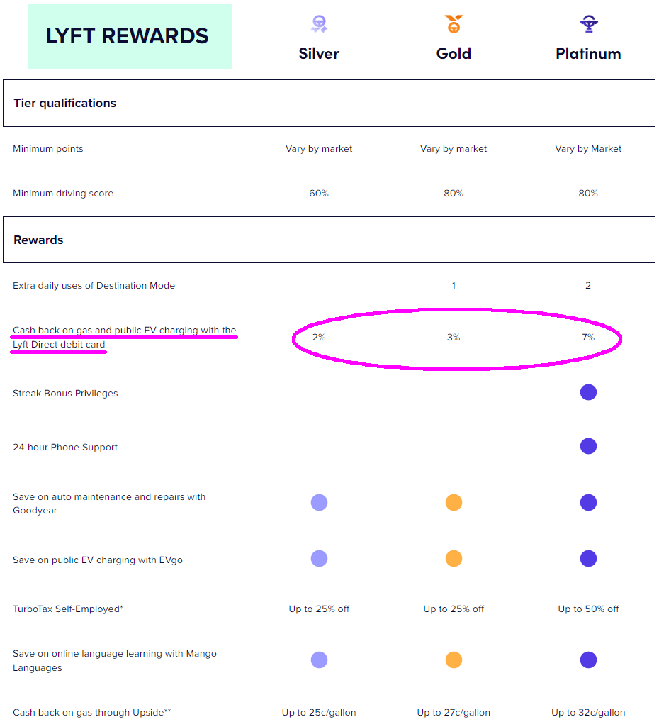 By using Lyft Direct, you will create a debit card account that will save you money on gas, dining, and groceries. The big one here is gasoline. Saving 2-7% on gas will net you around $400-$1800 dollars in savings per year, depending on how much you drive. Be sure to see the Lyft Rewards for Drivers chart–(Cut and pasted onto the bottom of this post.) Since gasoline is going up so high due to inflation or whatever, be sure to set up and use your Lyft Direct card ASAP to maximize your “make-save-earnings.”