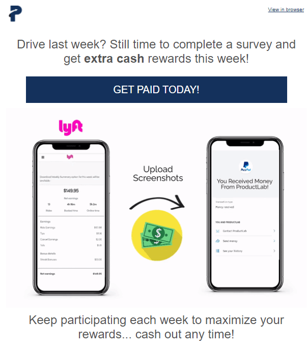 Definitely do this every week –Every Monday is the best time to do it because that’s when the survey comes out. There is also a way to have Product Lab send you an email reminder notification as well. It’s the fastest and easiest $7 you will make as a Lyft Driver. Also, $7*52 = $364 a year, so don’t miss out on it.